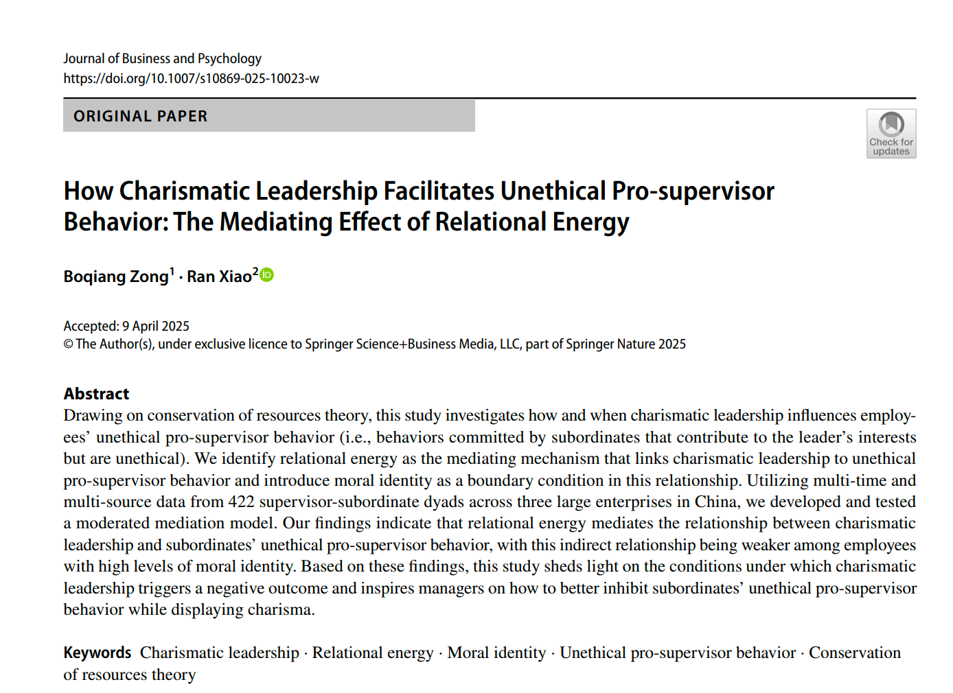 近日,我院教师宗博强博士的论文“How Charismatic Leadership Facilitates Unethical Pro‑supervisor Behavior: The Mediating Effect of Relational Energy”在国际学术期刊《Journal of Business and Psychology》线上刊发,论文第一署名单位为长沙理工大学,合作者有中国人民大学博士生肖然。DOI:https://doi.org/10.1007/s10869-025-10023-w。