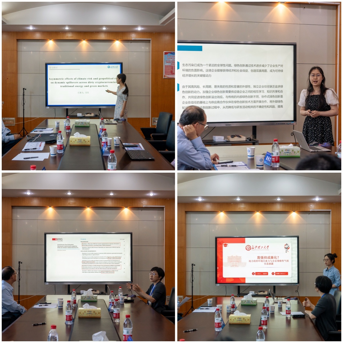 7日下午在经管大楼307室举行学术论文研讨会由长沙理工大学张新华教授主持。王竹泉教授探讨了企业异质性资源测度及其对财务报告改革的启示;沈洪涛教授从会计视角构建供应链低碳管理理论框架。长沙理工大学陈巧博士基于财会监管外生冲击,研究其稳定资本市场的机制;吴昊博士剖析了气候风险与地缘政治对加密货币、化石能源、绿色市场风险传递的影响;张茗博士利用社会网络分析探索供应链焦点企业对绿色协同创新的作用;博士生龙丽宇则分析了政府环境注意力对企业策略性气候信息披露行为的影响。吕长江教授、刘斌教授应邀担任点评专家从不同角度对论文进行了的精准点评,提出了完善建议。研讨会拓宽了研究视野,与会师生纷纷表示受益匪浅。