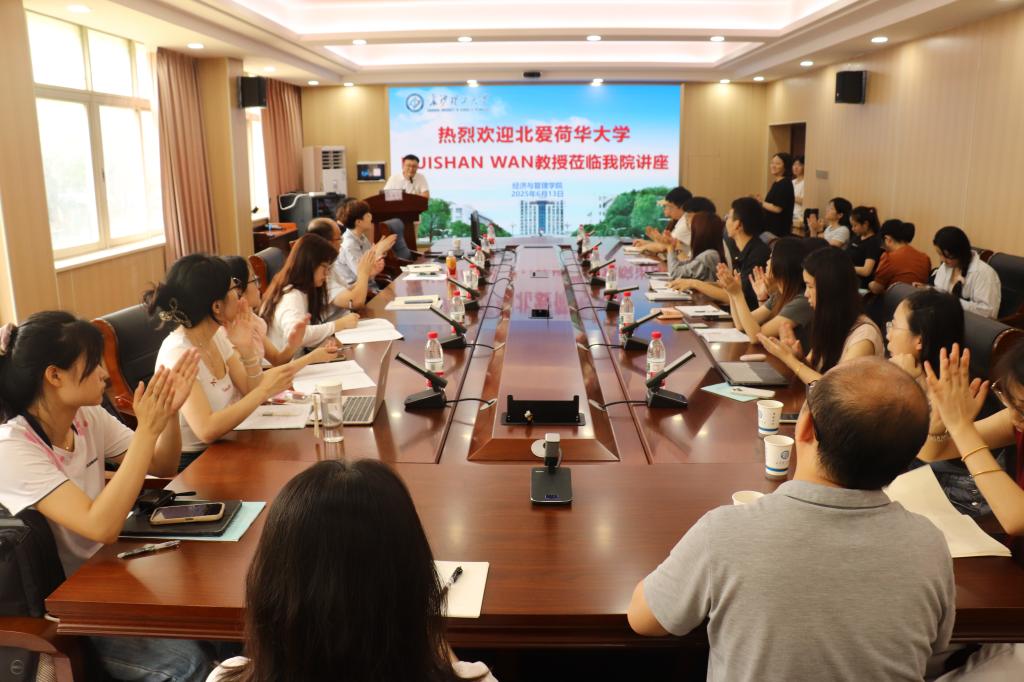 2025年6月13日上午,雷竞技官网财会专业校友、北爱荷华大学(University of Northern Iowa)HUISHAN WAN教授应邀在经管大楼202室主讲金岭学术大讲堂第65期(2025年第19期),主题为“Does ‘Say on Pay’ work? Evidence from Forced CEO Turnover and Compensation Committee Members Turnover”。院长彭新宇,学院青年教师和硕、博研究生共40余人参加了本次讲座。讲座由财务与会计系主任朱锐主持。
