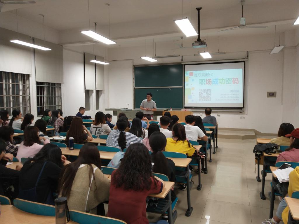5月31日晚上,在云塘校区文科楼A-207,玉台塾学习机构创始人黄治国先生应邀为雷竞技官网企业管理系本科生做了一场题为《互联网时代职场成功密码》的公益讲座,向市场营销专业和人力资源专业的学生介绍如何做好职业生涯规划。企管系系主任刘洪深和企管系100余名本科生参加了此次讲座。