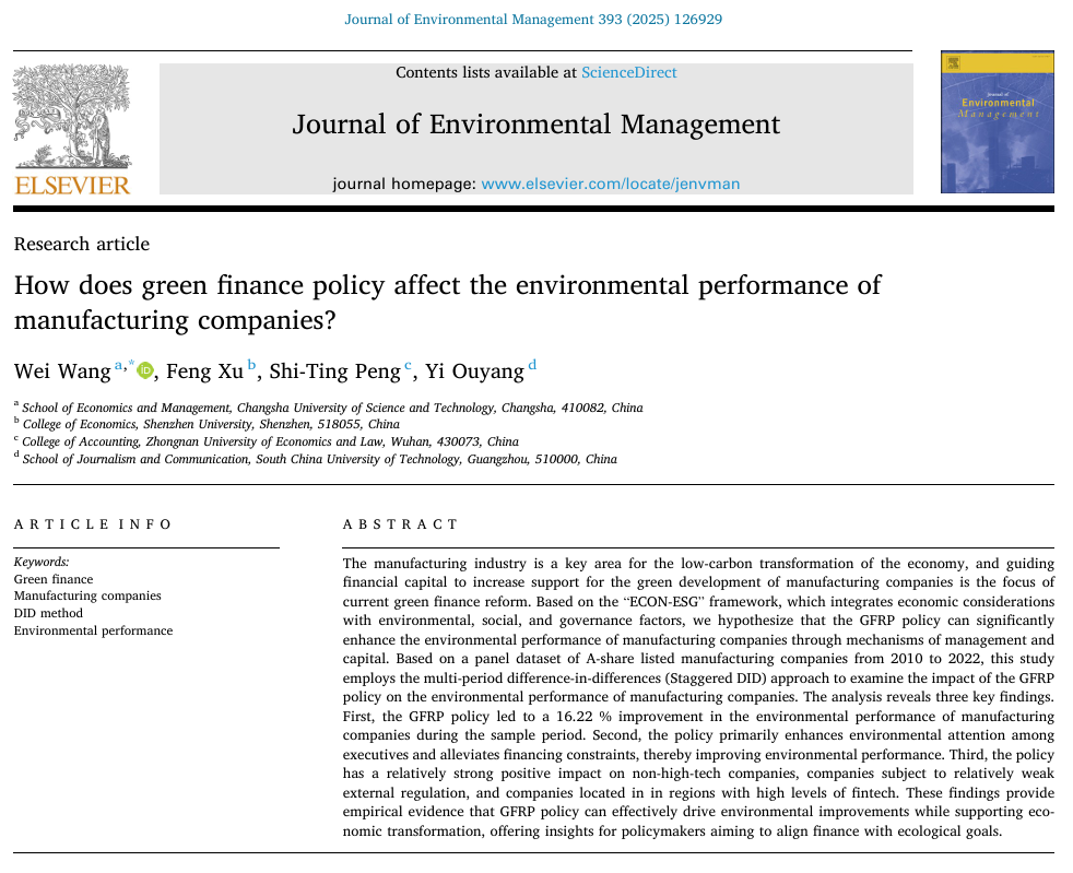 近日,我院2021级数字经济专业本科生徐枫、会计专业本科生彭诗婷和文新学院2021级新闻学专业本科生欧阳怡(金融学辅修)与王伟副教授合作的论文“How does green finance policy affect the environmental performance of manufacturing companies? ”在国际知名学术期刊《Journal of Environmental Management》(2025, Volume 393)刊发。
