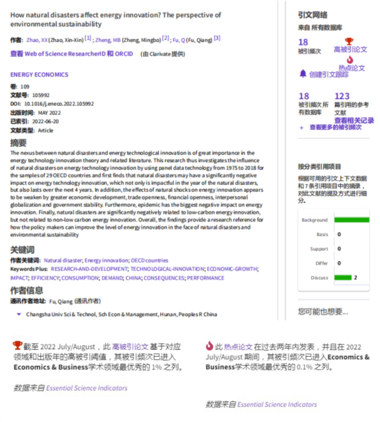 根据2022年最新ESI检索数据显示,由我院海外特聘专家张存炳教授指导,我院博士生付蔷为通讯作者,与西安交通大学博士生赵欣欣、长安大学讲师郑明波合作完成的学术论文《How natural disasters affect energy innovation? The perspective of environmental sustainability》入选2022年ESI热点论文与高被引论文。该论文于2022年5月发表在《Energy Economics》期刊。该刊当前影响因子为9.252,JCR分区为1区,属中科院Top期刊。