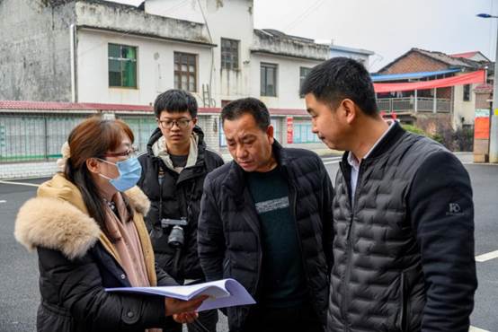 谢新梅老师(左一)与村支书沈细兴(右二)和总支部副书记沈慧锦(右一)交谈