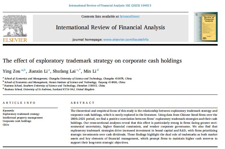 近日,我院2020级工商管理学博士生邹颖与导师黎建新教授以及另外两位校外作者合作撰写的论文“The effect of exploratory trademark strategy on corporate cash holdings”(探索性商标战略对公司现金持有的影响)在国际知名学术期刊《International Review of Financial Analysis》(国际金融分析评论)(2025, Volume 102)刊发,论文第一署名单位为长沙理工大学,该文数字对象标识码(DOI):10.1016/j.irfa.2025.104013。