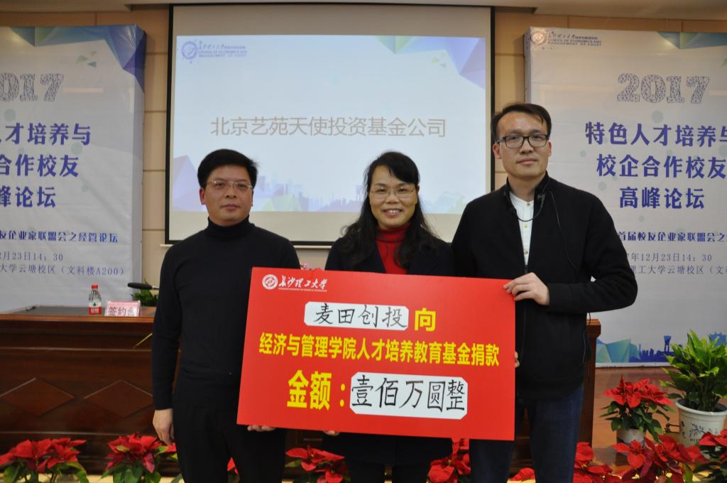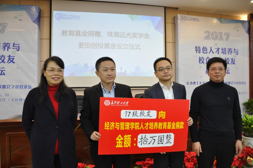 在捐赠环节,北京艺苑天使投资基金合伙人裴明高校友在学院设立了100万元天使创业基金,海南福山福湖置业有限公司董事长李道洪校友、华泰联合证券总经理陈锐校友代表97级校友捐赠10万元人才培养教育基金,远光共创智能科技股份有限公司总裁汪平校友设立珠海远光奖学金。在校企合作签约仪式环节,远光软件股份有限公司等五家校友企业先后与学院签订了校企合作协议,将和学院在科学研究、人才培养、就业实习、师资实训等方面进行更进一步的深度合作。