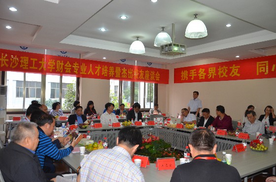 金秋十月的校园,处处洋溢着校友们阳光灿烂的笑脸。金盆岭校区的7号教学楼,绿树成荫,鲜花怒放,“欢迎校友回家”、“携手各界校友,同心砥砺前行”的红色条幅醒目地表达着经管学院师生的热切之情。2016年10月8日下午4点,经管学院在金盆岭校区7教204室隆重召开纪念办学60周年系列活动之“财会专业人才培养暨杰出校友座谈会”。此次座谈会邀请到国家能源局国际合作司原司长邹逸桥校友、中交建融租赁公司董事长兼党委书记张剑兴校友、深圳美河实业发展有限公司董事长刘明生校友、中交一公局总会计师张震校友、水利部长江委员会财务局局长王志宏校友、东北林业大学总会计师伍海泉校友、中交二航局总会计师刘东进校友、华能国际电力股份有限公司审计部主任刘明月校友、原国家电网英大财险副总肖其芝校友、深圳高速公路有限公司财务总经理孙斌校友、现代投资副总经理颜如意校友、湖南省审计厅金融审计处处长李作尧校友、湘潭技师学院院长易理中校友、中国大唐集团中兴能源科技公司总经理陈宏伟校友、原湖南电力公司总会计师刘友夫校友、五凌电力总会计师吴声涟校友、湖南电力公司财务部主任刘冬来校友、四川电力公司总会计师兼副总经理胡柏初校友、中电建水电开发集团有限公司总会计师罗朝国校友、福建省厦门市电力公司总会计师李冠凡校友、南方电网公司筹电公司总经理唐虎延校友、城云国际有限公司副总裁刘松源校友出席,中国水电顾问集团成都勘测设计研究院总会计师陆元务校友、杨世炳校友、张秋云校友、招商银行长沙分行风险管理部黄笑梅校友等杰出校友参加。副校长叶泽教授、院党委书记庄创奇、党委副书记艾楚君、副院长贺云龙、彭新宇、谢朝华,财务与会计系主任王治、退休教师代表宋谓熙、梁美华、陈均杰,财会系教师代表陈宏明、戴罗仙、杨学华、刘建英、袁江云等老师参加会议。座谈会由叶泽副校长主持。