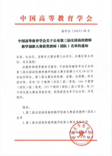 本届大赛由教育部教育部高等教育司指导、中国高等教育学会主办,以“推动教学创新,培养一流人才”为主题,旨在深入贯彻党的二十大精神,学习贯彻习近平总书记关于教育的重要论述,落实立德树人根本任务,助力课程思政建设和新工科、新医科、新农科、新文科建设,推动信息技术与高等教育教学融合创新发展,引导高校教师潜心教书育人,打造高校教学改革的风向标。大赛采用校赛、省赛、全国赛三级赛制,于2022年10月启动,按照“四新”建设、基础课程、课程思政等领域和参赛教师专业技术职务等级分组,设6个大组,每组下设正高、副高、中级及以下3个组,共计18个小组。全国32个赛区共1194所普通本科高校83224名教师参加校赛,23088名教师参加省赛,1701名教师(含团队成员)参加全国赛,其中有239门课程的898位教师入围全国赛现场评审。经过层层筛选,最终评选出一等奖72项、二等奖166项、三等奖227项。其中新文科正高组一等奖7项,二等奖17项,三等奖24项。