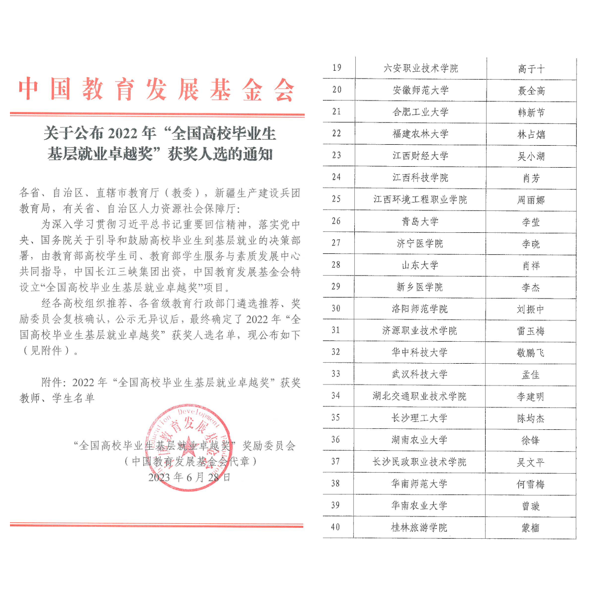 近期,由教育部高校学生司、教育部学生服务与素质发展中心共同指导,中国长江三峡集团出资,中国教育发展基金会设立的“全国高校毕业生基层就业卓越奖”项目获奖人选名单公布,我院陈均杰老师荣获2022年全国高校毕业生基层就业卓越奖。