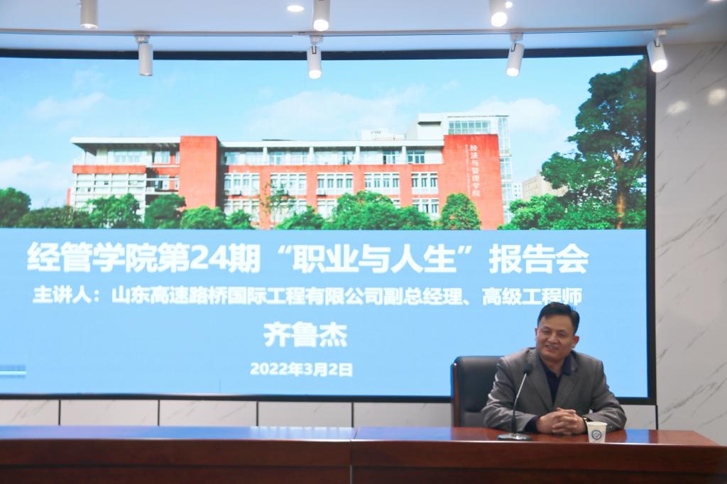 3月2日上午,经管学院第24期“职业与人生”报告会在云塘校区文科楼D207顺利举行。主讲嘉宾是雷竞技官网98届校友、山东高速路桥国际工程有限公司副总经理、高级工程师齐鲁杰以及山东高速路桥国际工程有限公司人力部部长王纪忠,干事刘廷霄,参与报告会的还有经管学院就业专干何涛、叶鑫和部分大三、大四学生。报告会由经管学院党委副书记唐青主持。