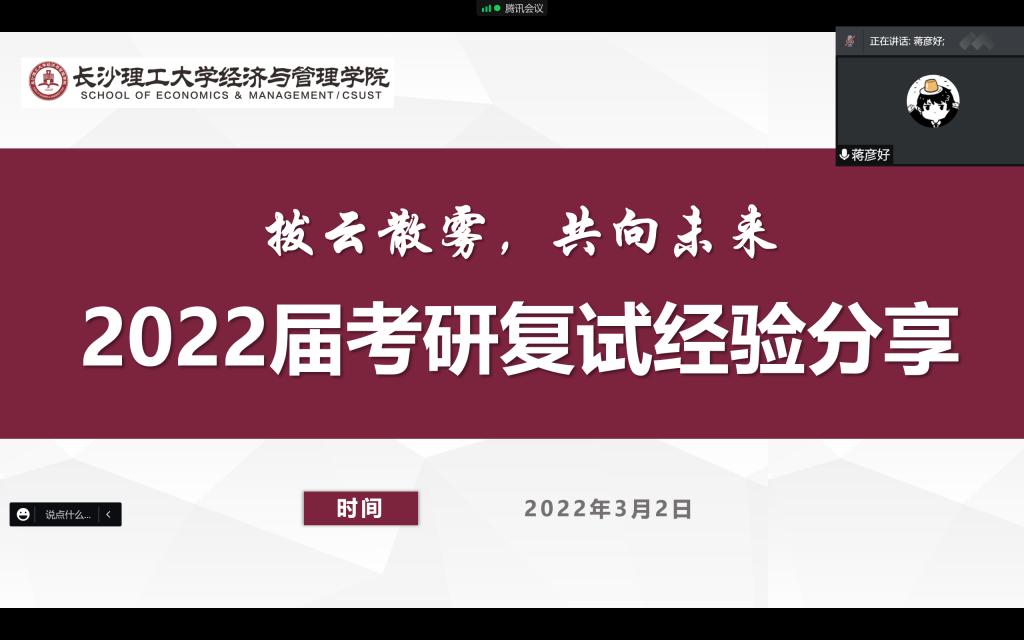 长沙理工大学工商管理学硕的朱芝椰从考研复试流程、专业课、英语口语、复试穿着与线上复试机器准备等方面,介绍了复试的相关内容。金融专硕的王媛媛表示要提前做好规划,笔试时注意时间分配,并提醒大家面试时要放松心态、注意姿态。会计专硕的蒋彦好说到,无论是闭卷或是开卷考试,都要扎实进行准备复习,要把握好框架,不要忽略宏观性的问题。应用经济学的周佩文主要介绍了如何掌握调剂信息、选择调剂学校,并推荐了一些信息搜集的渠道与方法。