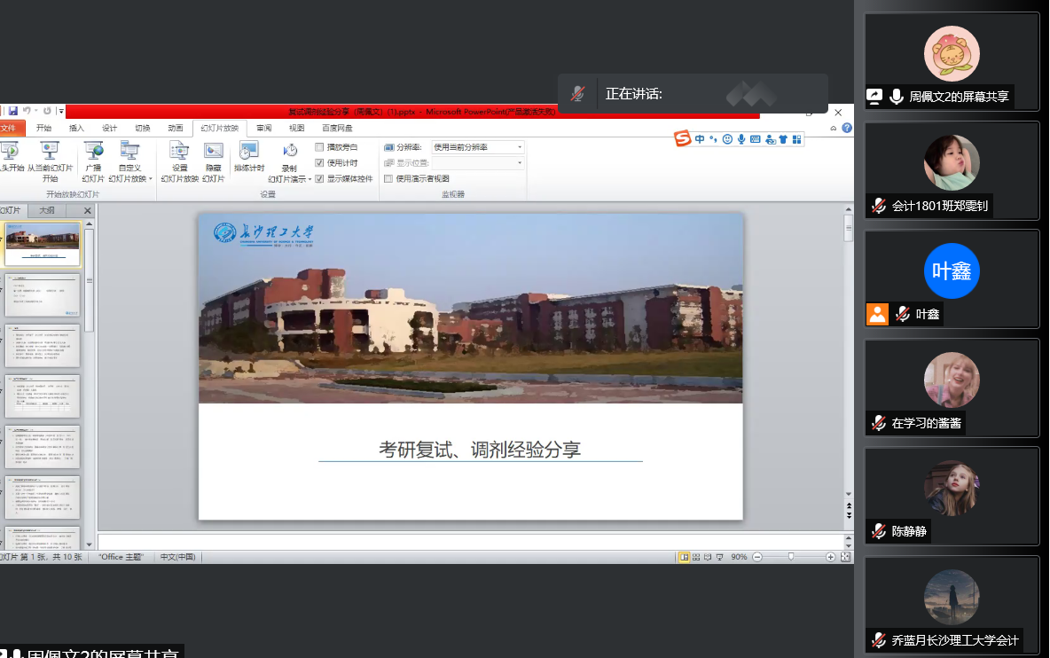 暨南大学金融学硕的周舒渲就如何准备复试以及复试的注意点进行了分享,并分享了一些2021年金融学硕的面试题目。中南财经政法大学金融专硕的孙梦鸽主要分享了线下面对面复试的注意事项。最后提问环节,六位学姐就同学们提出的问题一一-解答。