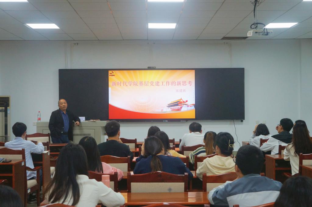 5月23日下午,经济与管理学院在金盆岭校区7教110开展学生党支部支委专题培训。本次培训由特邀党建组织员宋建社主讲,学生辅导员肖翠、杨舒文、叶鑫和13个学生党支部全体支委参加培训。