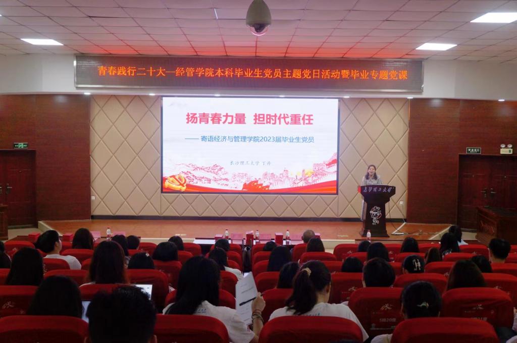 丁丹在毕业生离校前专题党课上,以《扬青春力量,担时代重任》为题,要求毕业生党员坚持学习与创新;坚定正确的价值观;坚守担当与奋斗。丁丹引用习近平总书记七年知青岁月的故事与大家共勉,强调“学习”的重要性。接着,她通过自己职业的成长之路,与大家分享在面对挑战和考验时的感悟,围绕“学习、创新、担当、奋斗”四个关键词,寄语毕业生党员珍惜人生中的每一天和生命中的每一个人,以更好的姿态面对生活中的困难,做一个有情怀、有温度、有内涵的人。