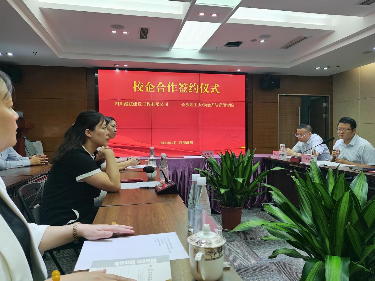 7月13日上午,长沙理工大学经济与管理学院与四川港航建设工程有限公司校企合作签约暨实践教育基地授牌仪式于四川港航公司会议室正式召开。参会人员有港航建设公司党总支书记兼董事长蔡贤俊、总工程师李建华、副总经理李航、陈晚华、李丹、张涛等公司领导及各部门中层干部代表,经管学院党委书记丁丹、副书记唐青出席,我院教务处主任王亮、专任教师文亮、辅导员杨舒文参会。会议由港航建设公司党总支委员、总工程师李建华主持。