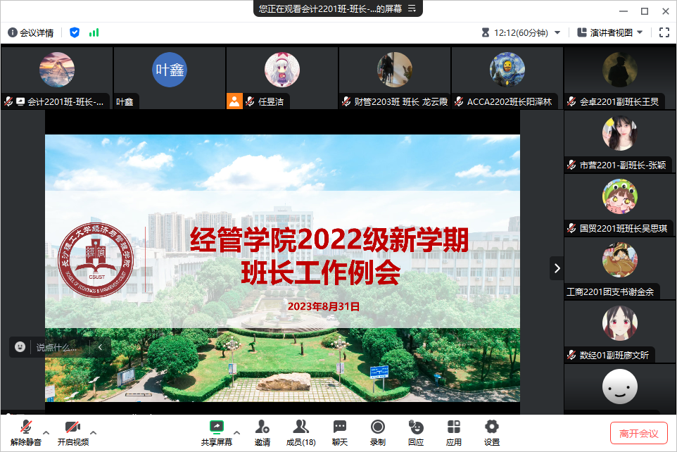 8月31日下午三点,经管学院利用腾讯会议召开2022级新学期班长工作例会。会议由2022级辅导员何涛、叶鑫主讲,22级各班班长、副班长参加。
