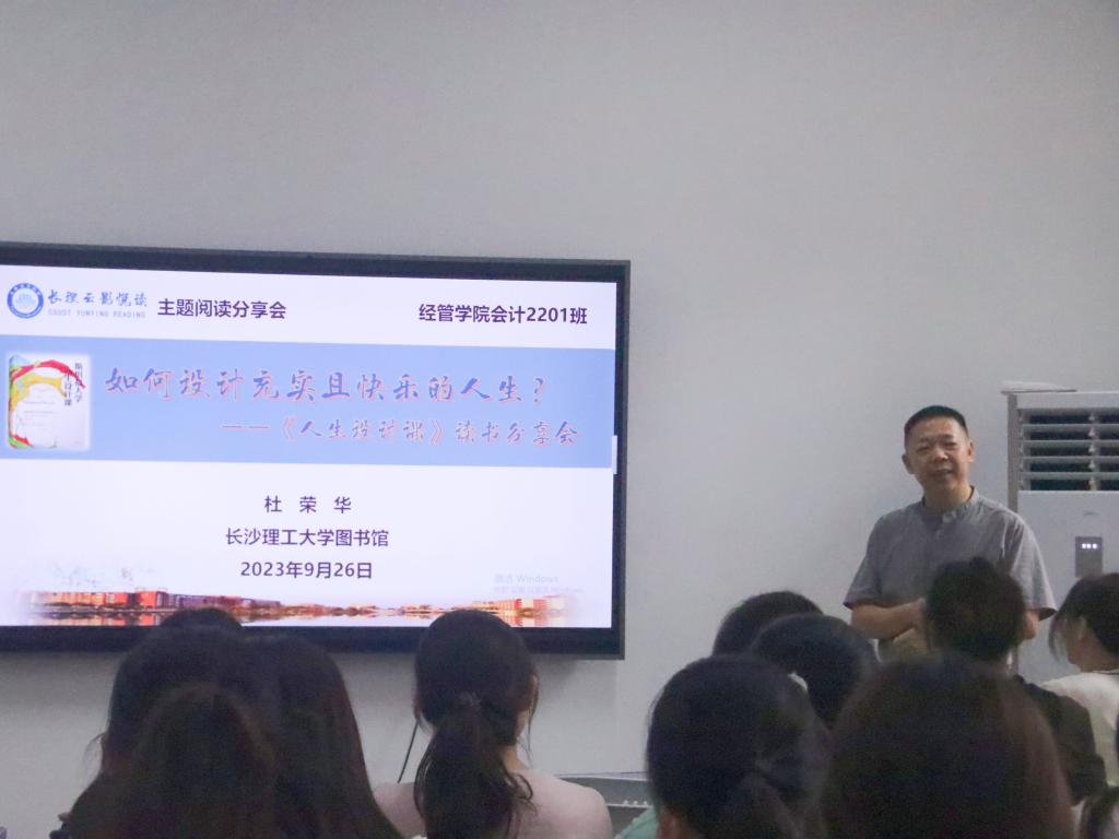 9月26日下午2:30,图书馆与经管学院会计2201班在金盆岭校区经管大楼101联合举办了一场关于“如何设计充实且快乐的人生”——《人生设计课》主题读书分享会。分享会由图书馆馆长杜荣华教授主讲,图书馆刘英老师和经管学院会计2201班全体同学参加此次活动。