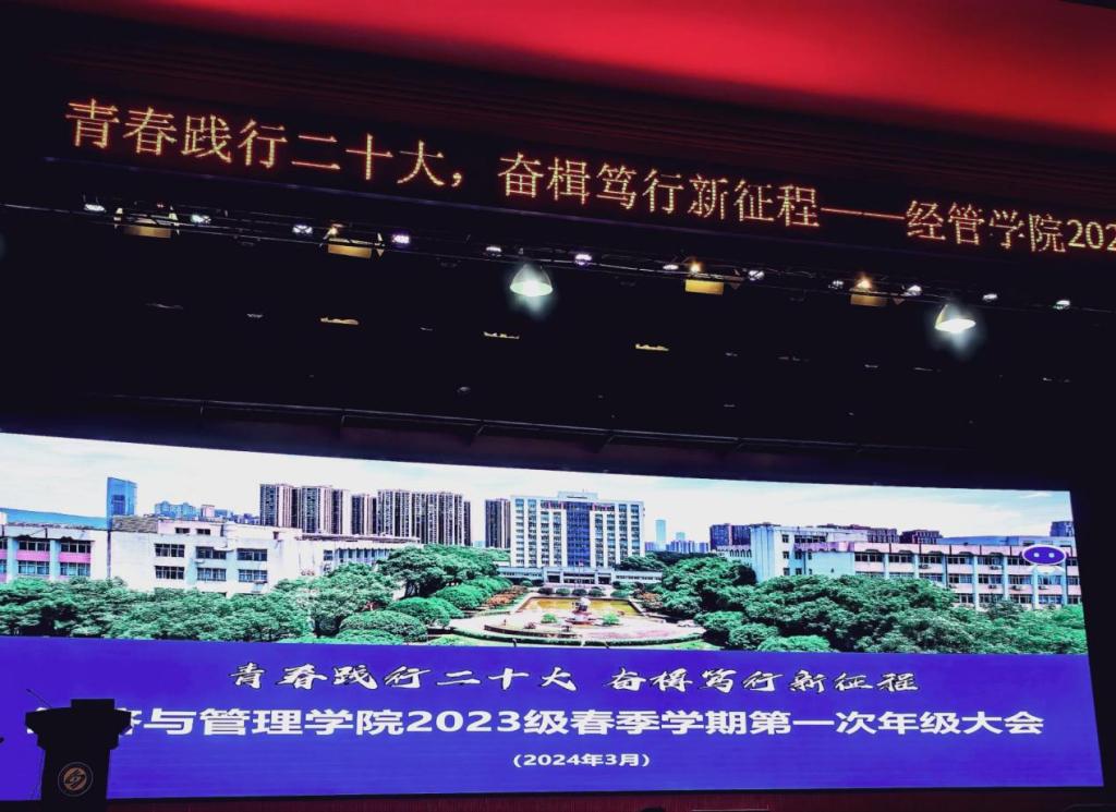 3月14日晚,经管学院在金盆岭校区五教大礼堂召开2023级春季学期第一次年级大会,本次大会以“青春践行二十大,奋楫笃行新征程”为主题,院党委副书记汪功伟、年级辅导员吴畏、段懿珊出席了会议,2023级全体学生参会。会议由段懿珊主持。