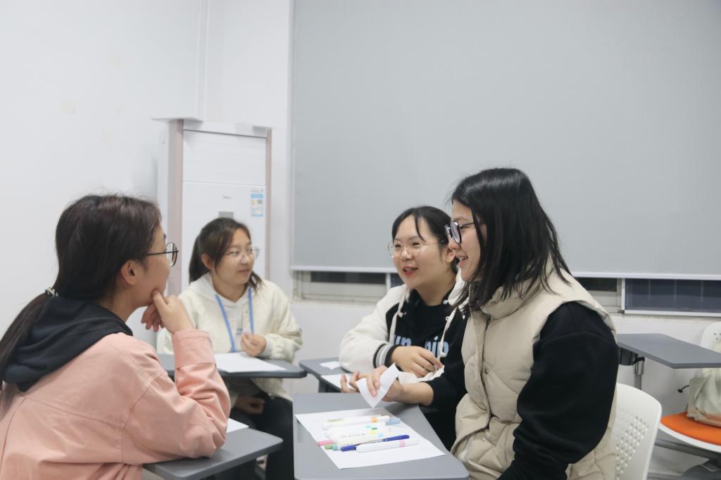 2024年4月11日晚,经管学院朋辈心理部副部孙斯雨在心理辅导员何艳芝老师的指引下带领大一大二年级学生在经管大楼101开展团体辅导。
