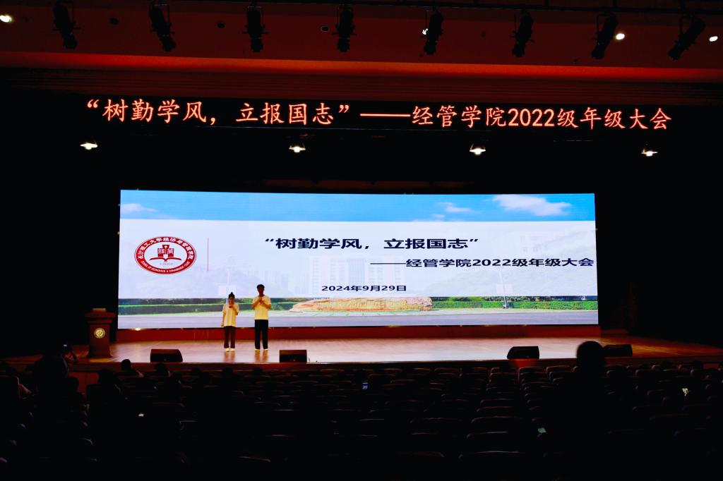 9月29日晚,经管学院在金盆岭校区五教大礼堂召开2022级秋季学期第一次年级大会。本次大会以“树勤学风,立报国志”为主题,院党委副书记汪功伟、年级辅导员何涛、叶鑫出席会议,2022级全体学生参加了年级大会。会议由2022级学生刘峻汐、李文芳主持。