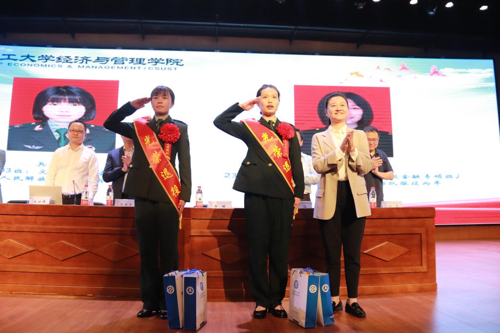 典礼上,彭新宇院长为过去一年中荣获学校卓越研究生奖学金以及校十佳大学生的熊智桥、程杰以及姚雁琼颁奖。马丽书记为2024级研究生郑兴娇和2022级本科生文思汝送上退役复学礼物。老生代表文思汝、研究生代表24级国际商务专硕林泽龙、本科生代表金融2401班何越懿依次作为学生代表发言。