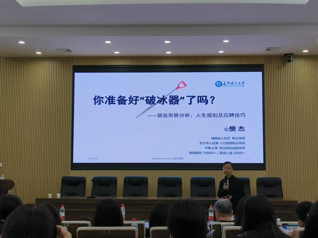 樊杰以“你准备好'破冰器'了吗?”为题,结合近五年来的就业难题、工作方式的变革、简历制作技巧等方面进行阐述,鼓励同学们树立终身学习理念,提升综合素质,找到心仪工作。