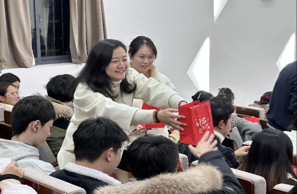 马丽进行发言。她首先肯定了考研学子们的辛勤付出,并向同学们表达真挚祝福与殷切希望。随后,在送大礼包环节中,学院为考研学子送上温暖水果卡、好运贺卡等物品的“考研加油礼包”,鼓励同学们调整好心理和身体状态,沉着冷静备考。其中院领导、老师、学弟学妹们手写的祝福贺卡,承载着他们的深切关怀和美好祝愿。活动现场氛围轻松而浓厚,相信考研学子们能缓解压力,将祝福化作动力,努力实现梦想。最后,学院领导老师和考研学子们进行了合影留念。