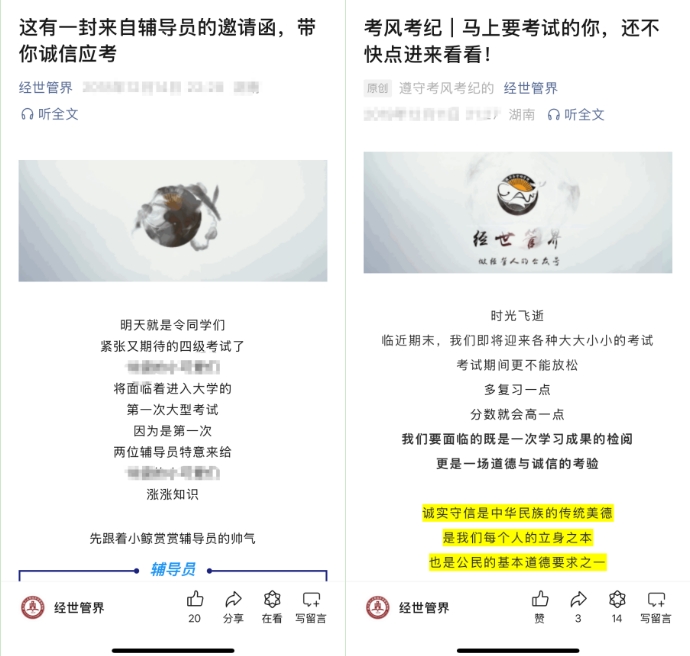 据悉,经管学院多措并举开展诚信考试教育以来,学院24级本科生本学期的25门课程、38个考场秩序井然,816位同学考风考纪良好。学院副书记汪功伟表示,考试是检验人才培养质量的重要环节,考风考纪直接关系到考试的公平、公正,“诚信考试警示板”不仅是宣传形式的变革,也是着力引导学生从“要我诚信”转变为“我要诚信”的重要举措。