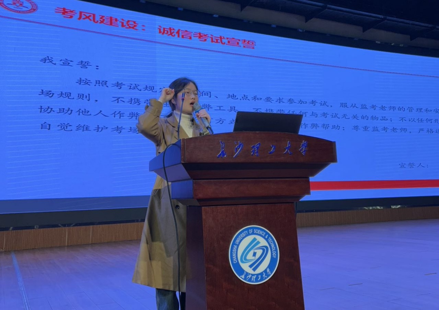 学生代表在诚信考试动员会上带领全体学生共同宣誓,立规矩、树导向、扬正气,郑重承诺遵守考试纪律,以诚为本,强化学生诚信认知认可,明确对考试舞弊零容忍责任。