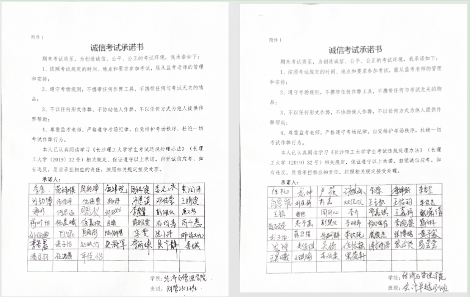 各年级辅导员组织学生签订《诚信考试承诺书》。进一步明确了自身的责任和义务,增强了自我管理能力,激发学生承诺践诺,言出必行,提升学生的道德品行和学习动力,形成全员诚信自我约束的良好氛围。