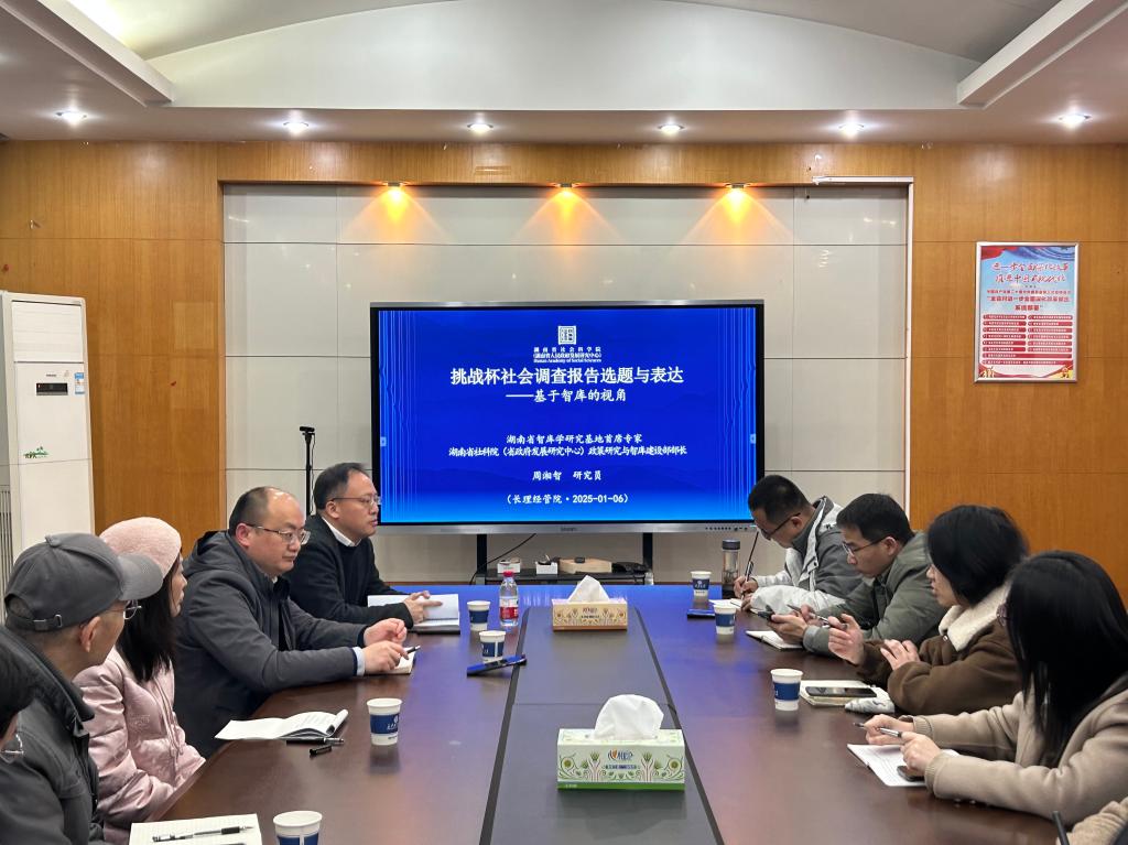 1月6日晚,经管学院于经管大楼307开展2025年“挑战杯”备赛培训会。会议邀请了湖南省智库学研究基地首席专家、湖南省社科院政策研究与智库建设部部长周湘智进行指导,带来了题为《挑战杯社会调查报告选题与表达——基于智库的视角》的报告。院长彭新宇,院党委副书记汪功伟以及三十余位师生代表参加。