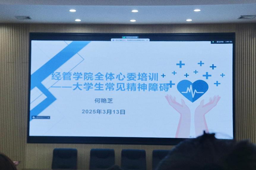 2025年3月13日19:30,经管学院在经管大楼100报告厅开展了以“大学生常见精神障碍”为主题的培训。心理辅导员何艳芝主讲,2021级、2022级、2023级、2024级全体心理委员和院朋辈心理部成员参加。