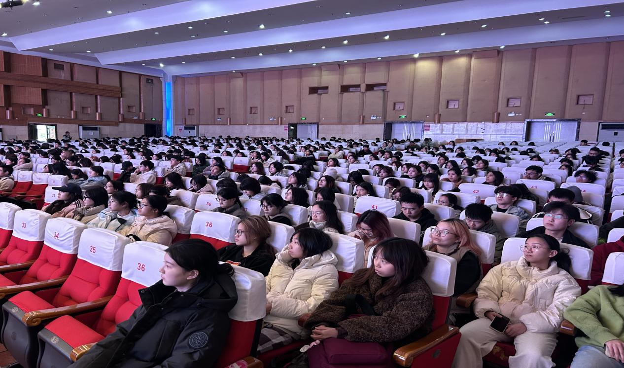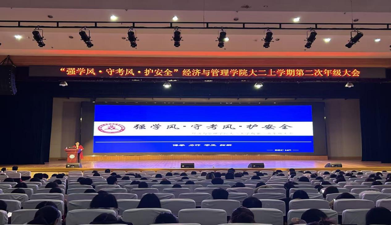 2025年12月16日下午,经管学院在金盆岭校区五教大礼堂召开“强学风、守考风、护安全”2024级年级大会。本次大会由年级辅导员何艳芝主持,学院党委副书记汪功伟、辅导员钟超和全体2024级学生参加。