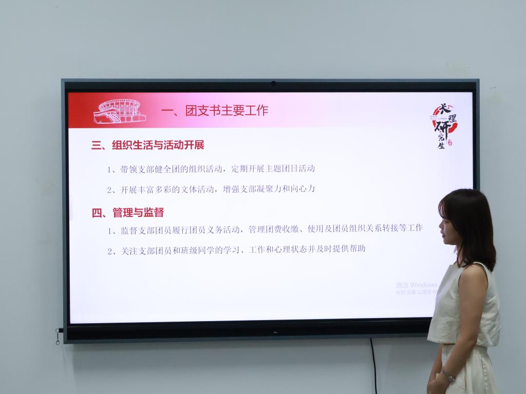 随后,周洁分享了作为23级经济班团支书的工作经验,她以“团支书的五项使命”为主题,深入浅出地介绍了团支书工作的方方面面。从初期的组织与建设,到团员的培养与发展,再到组织生活与活动的丰富多彩,以及管理与监督的严谨细致,直至智慧团建与青年大学习的深入推广,周洁团支书以其丰富的经验和独到的见解,为在座的每一位班干部描绘了一幅团支书工作的宏伟蓝图。她还特别强调了与班级同学建立紧密联系、增强团队凝聚力的重要性,并基于青年大学习的组织实践,提出了四点宝贵的工作建议,鼓励大家以更加细致入微的态度、更加积极主动的精神投入到学生干部的工作中去。