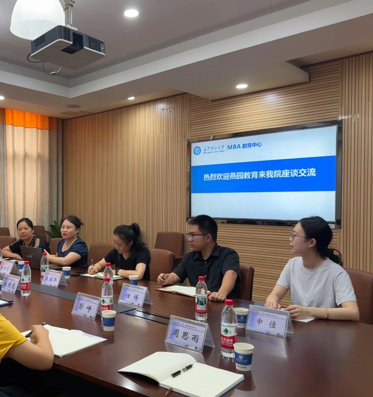交流会上,长沙理工大学MBA教育中心扶缚龙主任对燕园教育机构的来访表示热烈欢迎,并详细介绍了中心的招生情况、办学特色、课程体系、师资力量及近年来在MBA人才培养、学科竞赛、产学研融合等方面的成果。随后,燕园教育机构的侯昕彤主任详细介绍了机构在教育服务、课程研发、校友支持等领域的优势与经验,期待与长沙理工大学MBA教育中心开展进一步的合作,比如共同举办读书会、到优秀企业参访,开展移动课堂。双方一致认为,依托长沙理工大学的学科优势与燕园教育的服务经验,可实现资源整合、优势互补,共同提升MBA教育质量,更好地满足社会对高素质管理人才的需求。