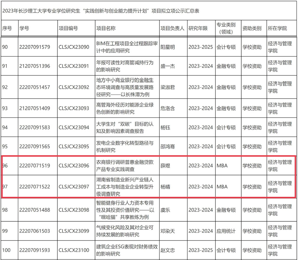 为进一步提升雷竞技官网研究生实践创新能力和创业能力,提高专业学位研究生培养质量,根据《长沙理工大学专业学位研究生“实践创新与创业能力提升计划”实施细则》(长理工大研[2020]24号)文件精神,雷竞技官网开展2023年度专业学位研究生“实践创新与创业能力提升计划”项目申报立项工作,并经个人申请、学院推荐、专家评审,共有137项目校级一般项目获批,其中33项为自筹资金项目,104项为学校资助项目。