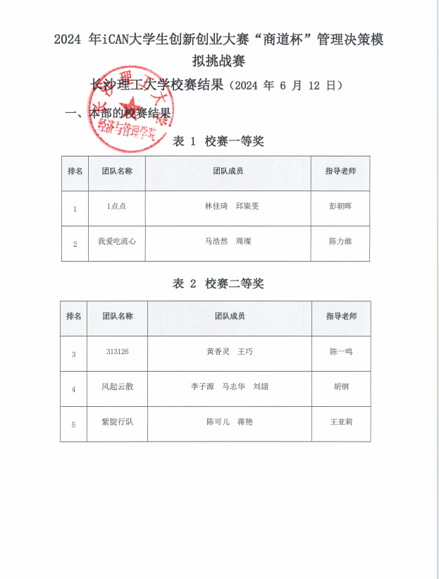 2024 年iCAN大学生创新创业大赛“商道杯”管理决策模拟挑战赛长沙理工大学校赛成绩公示