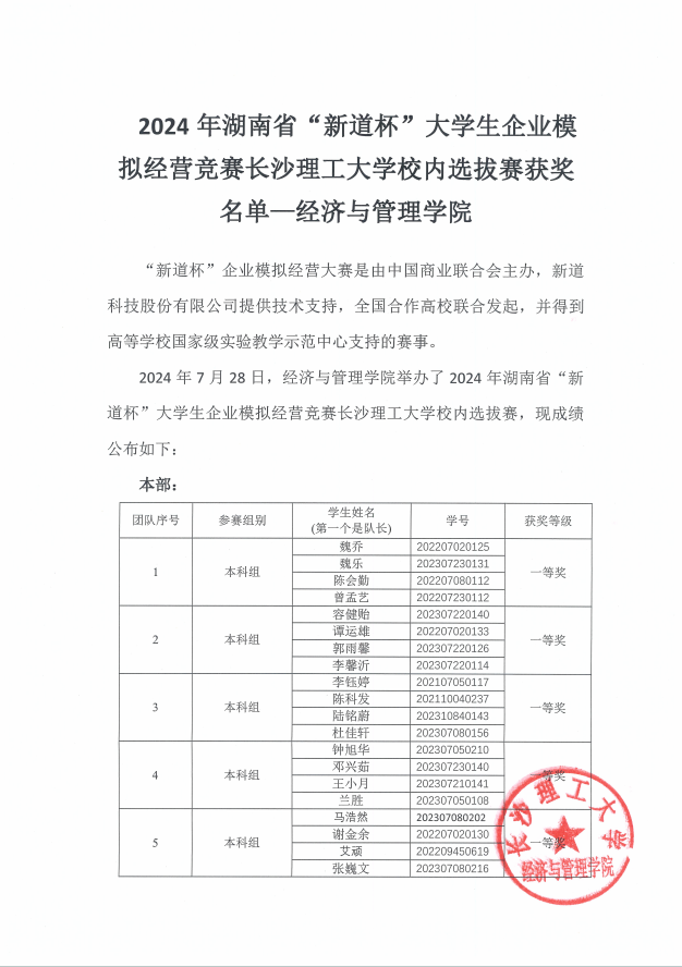 2024年湖南省“新道杯”大学生企业模拟经营竞赛长沙理工大学校内选拔赛获奖名单