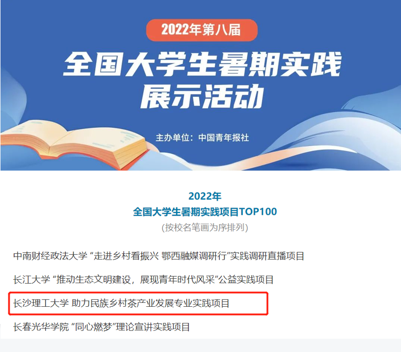 近日,2022年第八届全国大学生暑期实践展示活动名单公布,长沙理工大学经管学院“助力民族乡村茶产业发展专业实践项目”荣获2022年第八届全国大学生暑期实践TOP100。该项目是由经管学院敖洁教授指导,由21级公共管理班王梦晗、张晗、刘雅杰、王秀梅、刘敏、21级经济班石璐青等6名研究生组成的暑期社会实践团队完成。