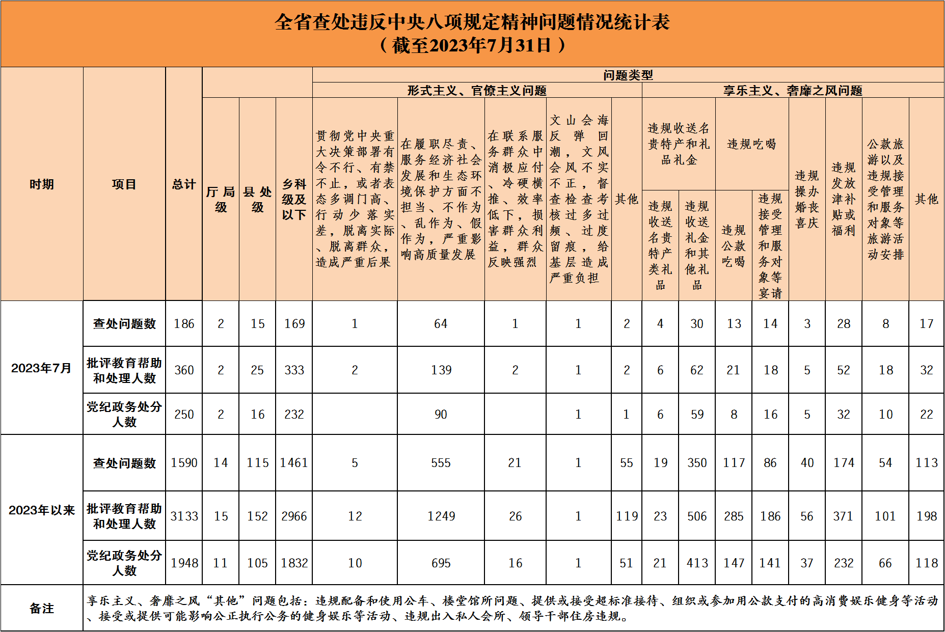 2023年7月全省查处违反中央八项规定精神问题186起