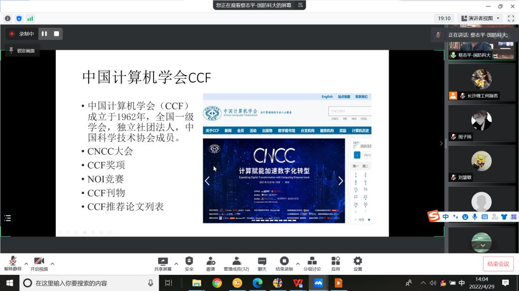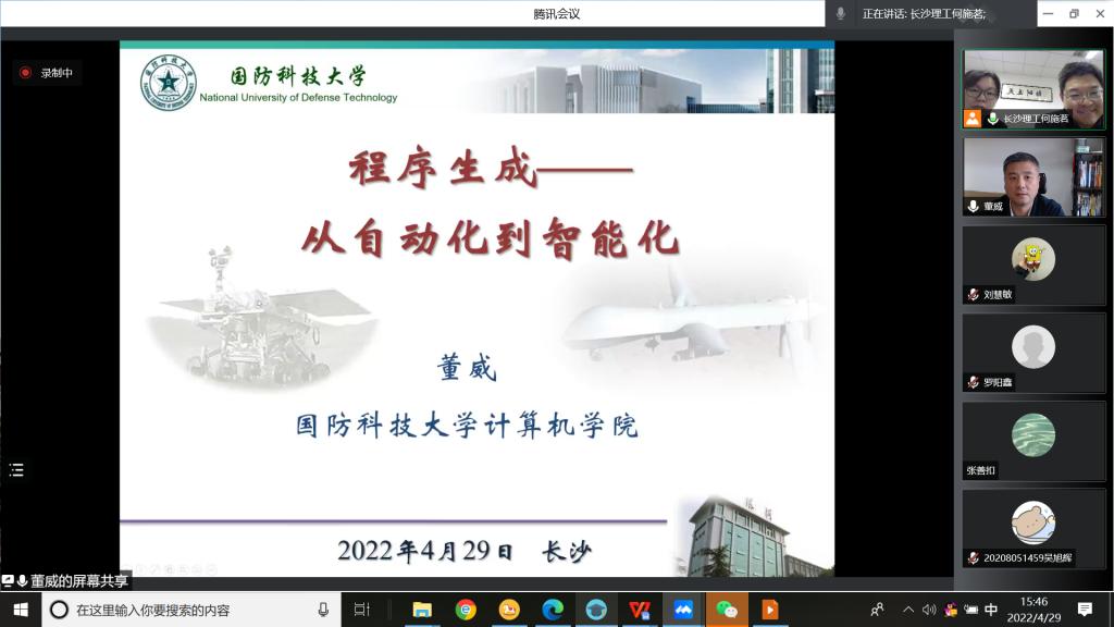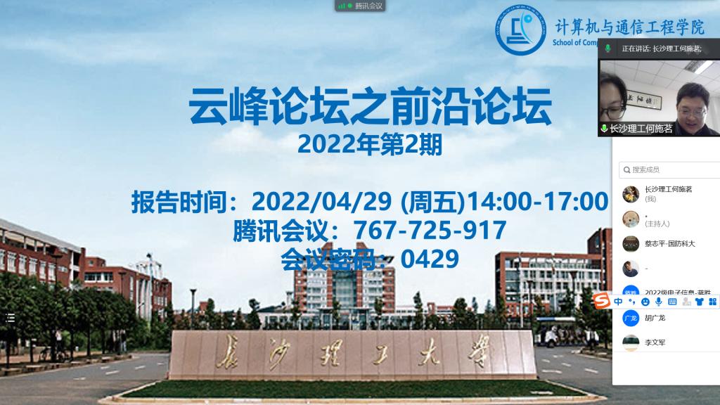 2022年4月29日下午,长沙理工大学计算机与通信工程学院“云峰”论坛之前沿论坛2022年第2期线上会议成功举行。本次会议邀请CCF专委会秘书长、国防科技大学计算机学院蔡志平教授、沈立教授、董威教授和赵宝康副教授分别做了“IPv6环境下的网络安全和智能测绘技术”、“全状态量子模拟器在CUP+GPU异构平台上的性能优化”、“程序生成——从自动化到智能化”和“6G时代的天地一体化网络技术”4场精彩的学术报告。同时4位老师也分别介绍了CCF理论计算机学科专委会、CCF体系结构专委会、CCF形式化方法专委会和CCF互联网专委会。报告会由长沙理工大学计算机与通信工程学院张锦院长和何施茗副院长共同主持。我院师生160余人积极参加了此次报告会。