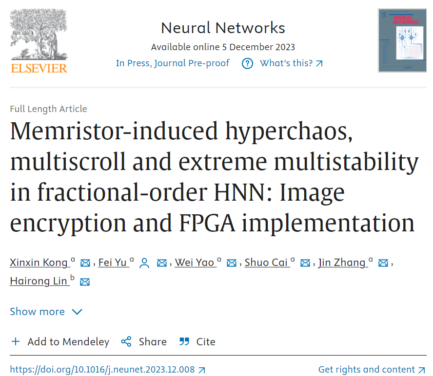 近日,我院余飞副教授与合作者在人工智能领域顶级期刊《Neural Networks》上发表了论文“Memristor-induced hyperchaos, multiscroll and extreme multistability in fractional-order HNN: Image encryption and FPGA implementation”(https://doi.org/10.1016/j.neunet.2023.12.008)。学院研究生孔新新为第一作者,导师余飞副教授为通讯作者。Neural Networks作为中科院1区,CCF人工智能方向的B类期刊,是人工智能学科顶级期刊,收录了人工智能领域最前沿的高端论文,目前影响因子为7.8