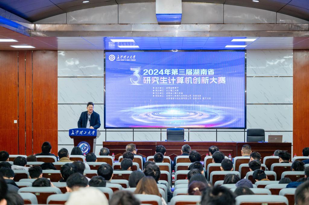 秉承党中央、国务院关于科技创新的坚定方针,为深化实施党的二十大精神关于“推进科技强国建设”的战略布局,加速教育链、人才链与产业链、创新链的深度融合,2024年11月30日,第三届湖南省研究生计算机创新大赛决赛在长沙理工大学金盆岭校区举办,大会由大赛组委会副主任、长沙理工大学计算机与通信工程学院院长张锦主持。