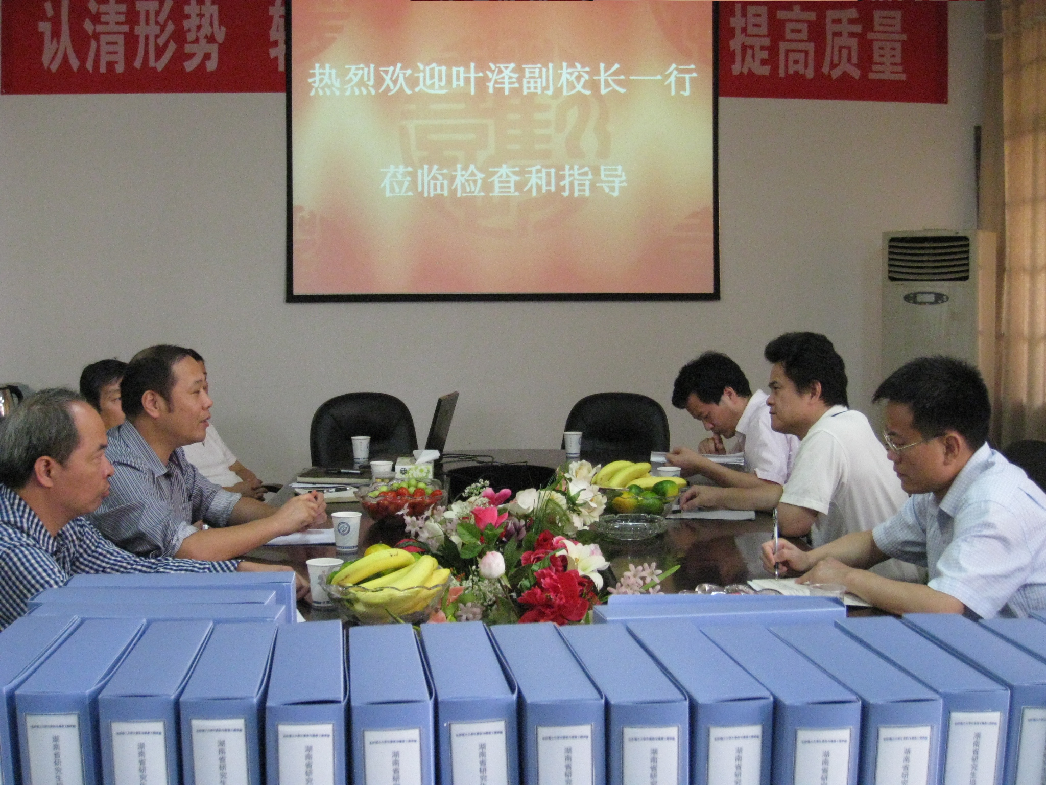 叶泽副校长对我院的迎评工作进行了指导,并对我院迎评准备工作给予了充分的肯定,同时也指出研究生教育工作应更好地突出特色,重视研究生教育过程中方式方法的完善和思索,进行教研教改创新,以跳跃式思维发展科研,为研究生提供更好的实践平台。最后,数计学院李应求院长、周富照、黄斌等领导专家认真仔细地检查了我院的评估材料,并提出很多宝贵意见。