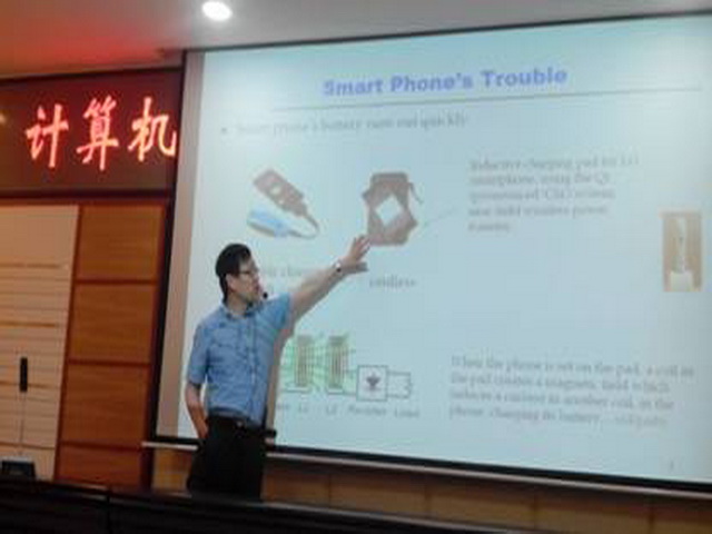 杨鲲教授首先介绍了无线能量传输的概念,对无线能量传输的基本原理、电动汽车无线充电的应用和目前极少数无线能量传输的案例进行了简要介绍,然后提出了无线信息与能量的协作传输的问题(WIEC),该问题基于集成了信息与能量采集功能的小型移动终端而提出来,并对WIEC问题提出了一个基本优化框架和解决办法,为我院相关领域的老师继续进行相关研究提供了可行的思路。杨老师的报告激发了我院教师和学生的浓厚兴趣,报告结束后部分老师和学生仍然对WIEC中的细节问题在B311进行了探讨。