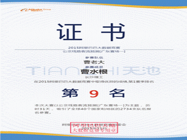 计通学院14级研究生曹水根同学在2015阿里巴巴天池大数据竞赛中获得第九名