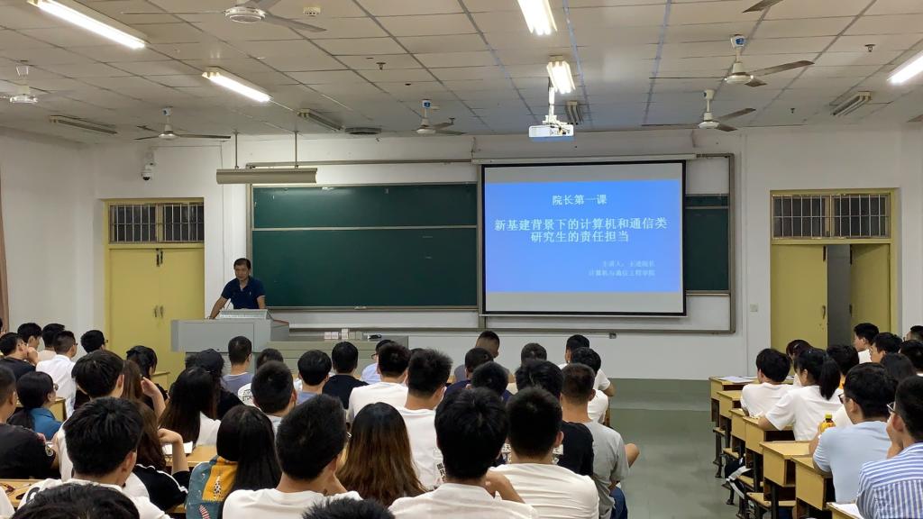 初秋九月的长理,清爽恬静。为帮助研究生新生树立人生目标、不忘考研初心,铸就追求卓越、潜心研究的品格,计算机与通信工程学院9月14日晚在金盆岭校区一号教学楼A201,开展了研究生新生入学教育之“院长第一课”,主题为“新基建背景下的计算机和通信类研究生的责任担当”。院长王进教授、副院长张建明教授以及辅导员易亭亭老师出席此次会议,2020级全体研究生参加。
