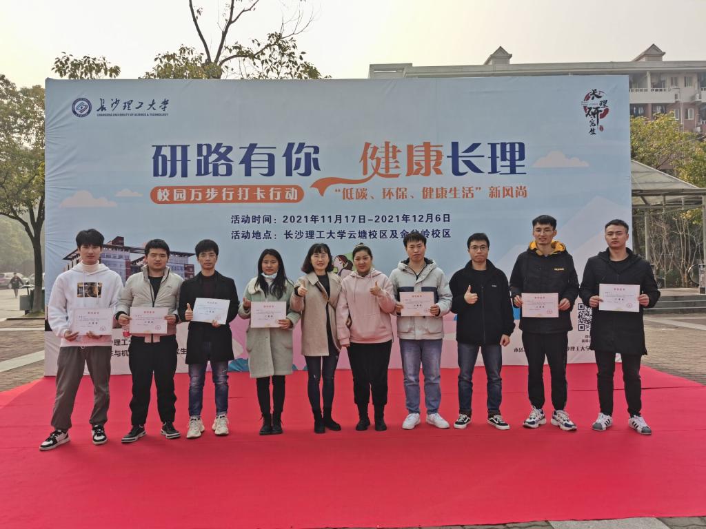 为倡导绿色出行,引领低碳生活,由长沙理工大学研究生会主办、汽车与机械工程学院研究生会承办的“研路有你,健康长理”校园万步行打卡暨点亮长理美景地图活动于2021年11月17日至12月6日举行,全校参加人数超过1500人,我院同学亦积极参加。12月9日该活动在云塘校区汀香广场举行闭幕颁奖仪式宣告此活动圆满结束。