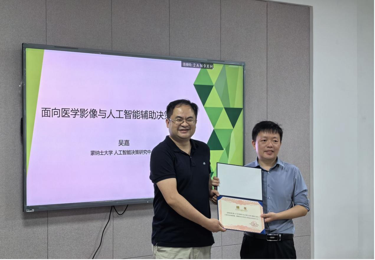 2024年5月16日下午15:00,计算机与通信工程学院在金盆岭校区九教211室举办了主题为博力学术论坛——《面向医学影像与人工智能辅助决策》的学术讲座,讲座由计通学院李文军教授主持。讲座主讲人为澳大利亚莫纳什大学吴嘉教授。计通学院聘请吴嘉同志为学院特聘教授,李文军教授为吴嘉教授颁发聘书。计通学院邝丽丹老师及研究生参加了本次学术讲座。