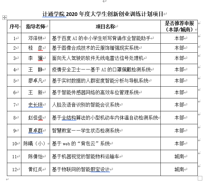 经指导老师申报,学院组织专家对本院(含城南学院)19项大学生创新创业训练计划项目进行评审,下列12个项目被推荐申报2020年度大学生创新创业训练计划项目(见附表)。现予公示,如有异议,请于2020年6月20日前反馈至教务办。
