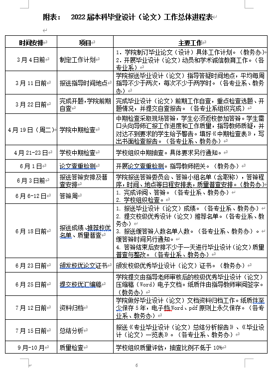 为做好2022届毕业设计(论文)工作,落实教育部关于印发《本科毕业论文(设计)抽检办法(试行)》的通知(教督〔2020〕5号),确保毕业设计(论文)教学质量,现就有关事项通知如下: